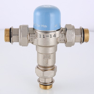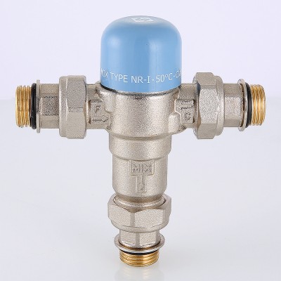 Трехходовой термостатический смесительный клапан VALTEC THERMOMIX предназначен для автоматического поддержания заданной температуры в системе горячего водоснабжения. Ее превышение исключается даже при полном отключении холодной воды, что позволяет использовать смеситель в школах, детских садах, других общественных зданиях. Клапан оперативно реагирует на изменение температуры и давления входящих потоков. Модель NR – нерегулируемая, с фиксированной заводской настройкой (47 oC). Клапан выполнен из качественной латуни, никелирован. Встроенный термочувствительный элемент – жидкостного типа (наполнен толуолом). Патрубки клапана соединены накидными гайками с полусгонами. Резьба присоединений – внешняя. Входы смесителя оснащены обратными клапанами из нейлона. Максимальная температура на входе горячей воды – 90 oC, допустимое рабочее давление входных потоков – до 10 бар.