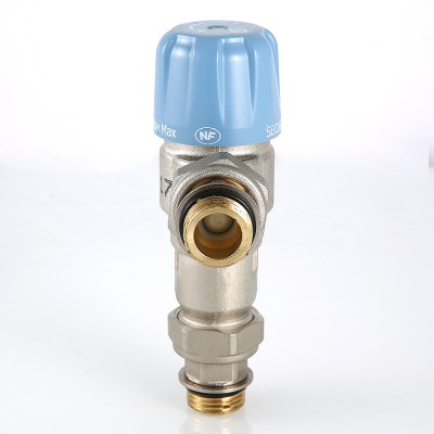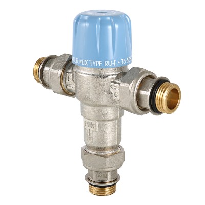 Трехходовой термостатический смесительный клапан VALTEC THERMOMIX с изменяемой в диапазоне от 30 до 50 oC настройкой. Предназначен для автоматического поддержания заданной температуры в системе горячего водоснабжения. Ее превышение исключается даже при полном отключении холодной воды, что позволяет использовать смеситель в школах, детских садах, других общественных зданиях. Термостат оперативно реагирует на изменение температуры и давления входящих потоков. Клапан выполнен из качественной латуни, никелирован. Встроенный термочувствительный элемент – жидкостного типа (наполнен толуолом). Патрубки клапана соединены накидными гайками с полусгонами. Резьба присоединений – внешняя. Входы смесителя комплектуются обратными клапанами из нейлона. Максимальная температура на входе горячей воды – 90 oC, допустимое рабочее давление входных потоков – до 10 бар.