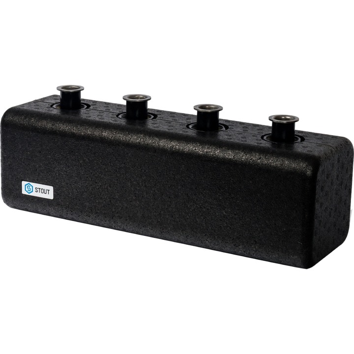 Распределительный коллектор STOUT представляют собой одну стальную коробчатую трубу прямоугольного сечения вместо обычно двух, к которой снизу и сверху соосно приварены парные патрубки (входные и выходные). Внутри трубы выполнены фигурные перегородки для разграничения прямого и обратного потоков теплоносителя и организации распределения его между всеми выходными патрубкам коллектора. Зигзагообразная форма перегородок позволила расположить патрубки вдоль одной оси коллектора.