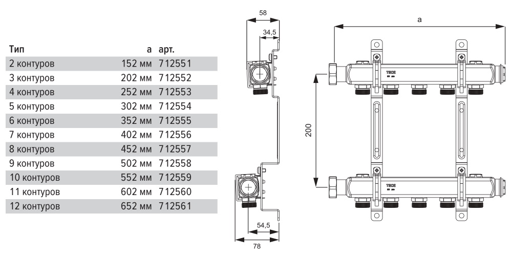 Коллектор TECE для систем отопления без вентилей 1х3/4ЕК 6 контуров, квадратное сечение
