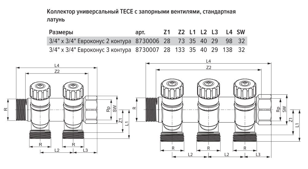 Коллектор TECE с запорными вентилями, 3/4" ВР/НР, с выводами 3/4" Евроконус