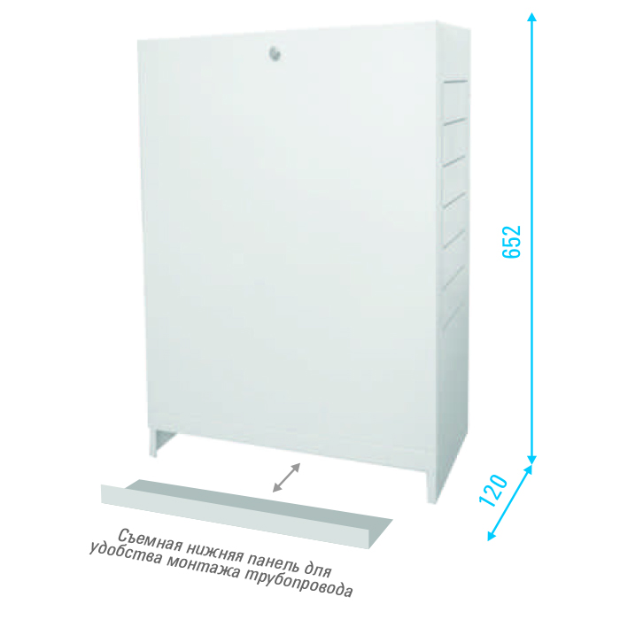 Коллекторный шкаф ШРН стандартной глубины — применяется для монтажа и скрытия с глаз такого оборудования, как коллекторные группы, коллектора, запорная арматура, а так же другие компоненты по мере необходимости. Этот коллекторный шкаф является накладным на стену и изготовлен из стали толщиной 0.8 мм, покрытой порошковым напылением. Перед окраской на производстве осуществляется процесс фосфатирования. Стандартная глубина устройства (120 мм против 150 мм у глубокого шкафа) далеко не всегда позволяет размещать в нем смесительные узлы с насосами. Ящик имеет на передней двери защелку под отвертку для ее закрывания. Ключ не предусмотрен. В коробке для защиты при транспортировке поверхность оборудования покрыта пленкой. ОТКРЫВАЕТСЯ БЕЗ КЛЮЧА ЛЮБЫМ ПЛОСКИМ ПРЕДМЕТОМ!