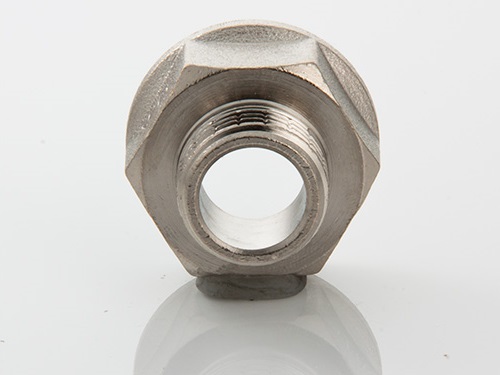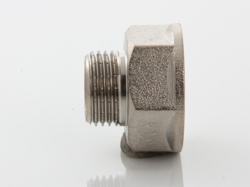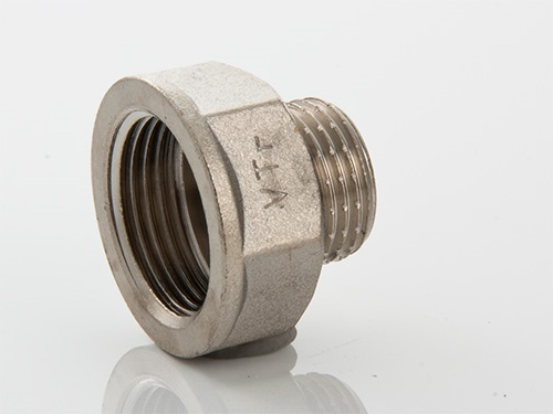 Назначение фитинга – переход с внутренней резьбы на наружную (больший/меньший диаметр). Переходник изготовлен горячим штампованием из латуни CW617N с последующим никелированием. Корпус фитинга – шестигранный – под гаечный ключ. Резьба – трубная цилиндрическая, совместимая с наружной конической по ГОСТу 6211. Номинальное давление – 40/25 бар (для типоразмеров до/более 1”). Максимальное рабочее давление при температуре среды 250 °С – 2,7/1,7 бара. Переходник применим на стальных, медных, латунных, пластиковых, металлопластиковых трубопроводах.
