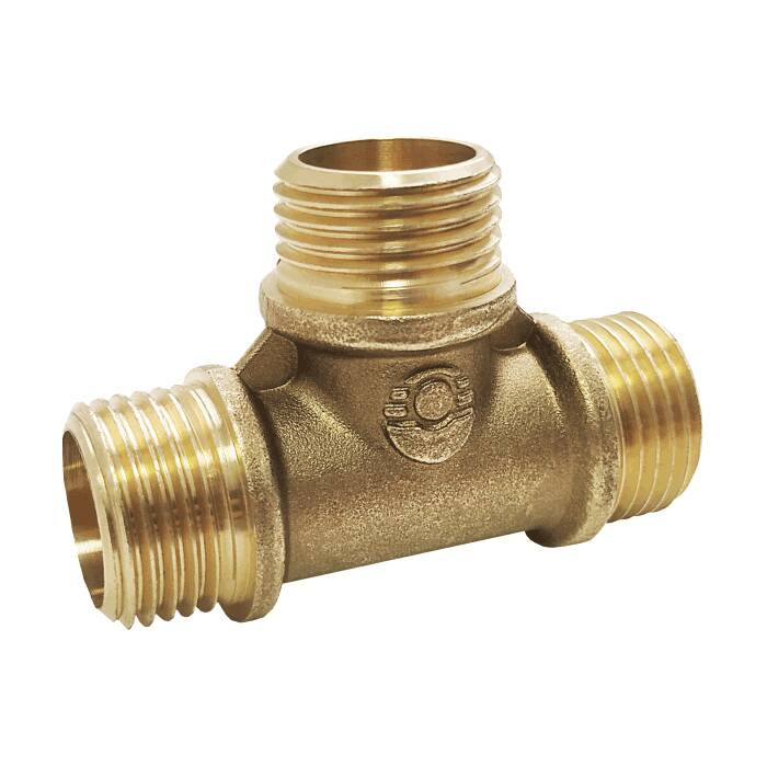 Латунный трехсторонний фитинг, равнопроходной, соединяющий три отрезка трубы, один из которых устанавливается перпендикулярно двум другим.