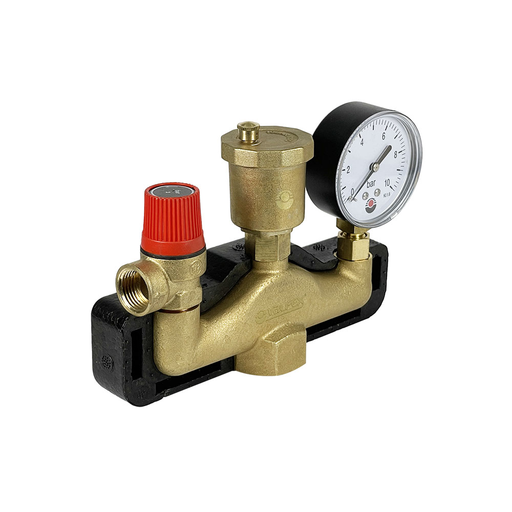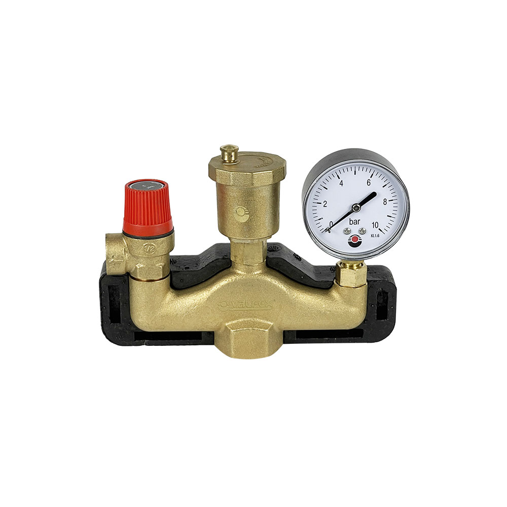 Консоль группы безопасности VF.461.0.3 имеет одно отверстие для присоединения к системе с внутренней трубной цилиндрической резьбой 1 дюйм. Манометр входит в состав групп безопасности и помогает визуально контролировать давление. Он присоединен к консоли посредством отсекающего клапана, который позволяет производить монтаж и демонтаж манометра без опорожнения системы. За счет единого комплекта группа облегчает монтаж и обслуживание оборудования.