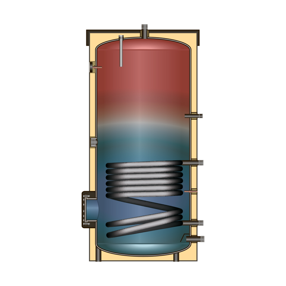 Эмалированная ёмкость из чёрной стали (S235JR) с одним змеевиком косвенного нагрева. Изоляция - вспенённый полиуретан (несъёмная), закрывается съёмным декоративным кожухом на молнии. Цвет кожуха - RAL 9006 (серебристый). Предназначена для приготовления санитарной горячей воды.