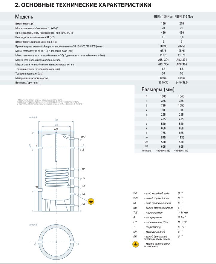 Бойлер косвенного нагрева RISPA RBFN NEO 160 напольный (нерж. сталь 304)