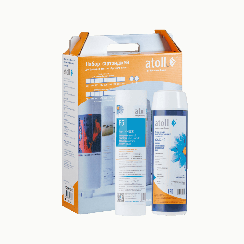 - atoll P5 (полипропиленовый) — фильтрация от примесей, нерастворимых в воде, размер которых больше 5 микрон;