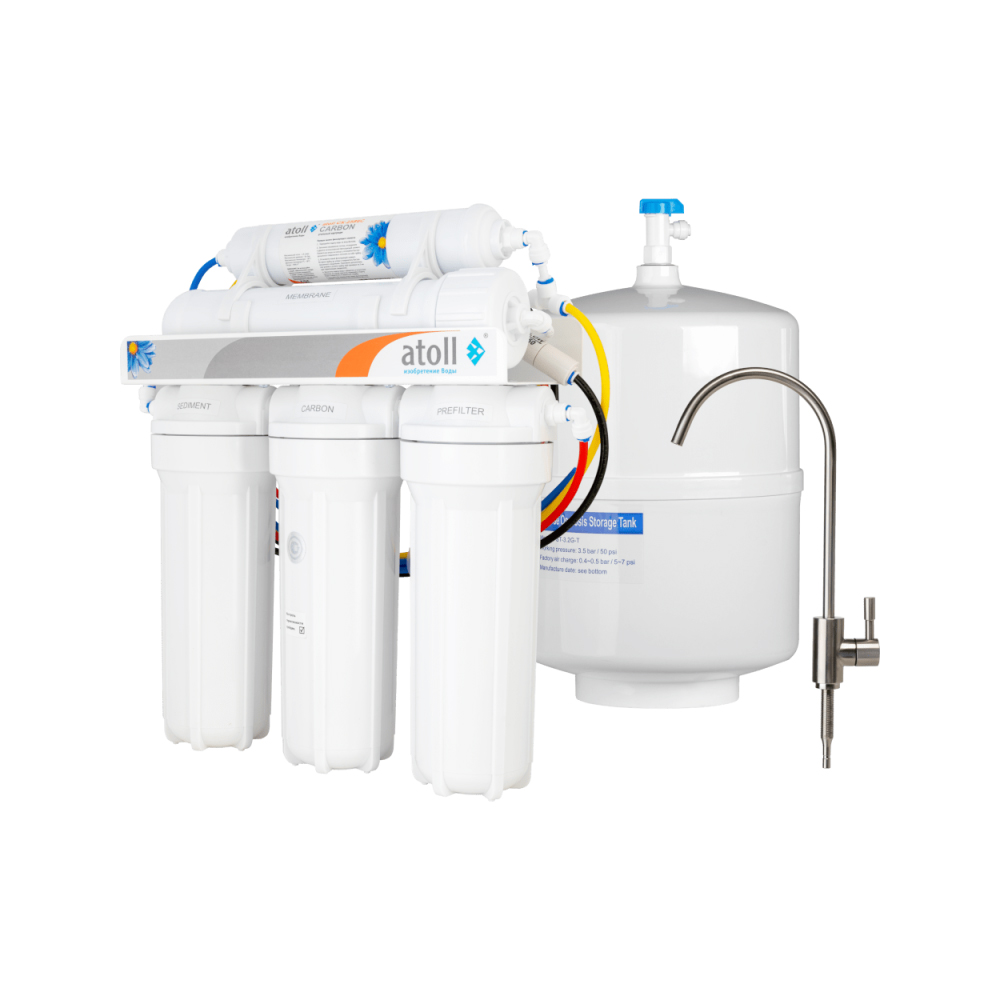 Атолл Патриот A-5100 — это система обратного осмоса для очистки холодной воды. Процесс фильтрации на основе полупроницаемости полиамидной тонкопленочной мембраны исключает применение химических веществ.