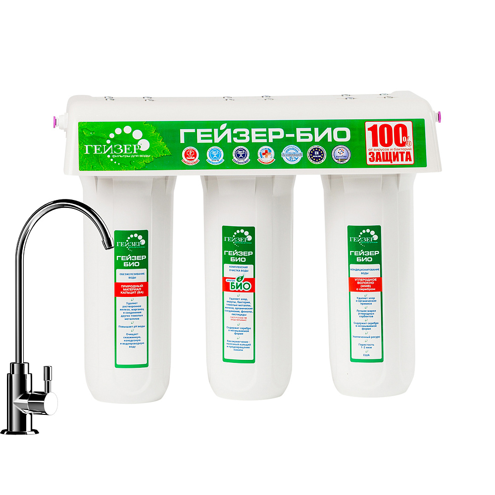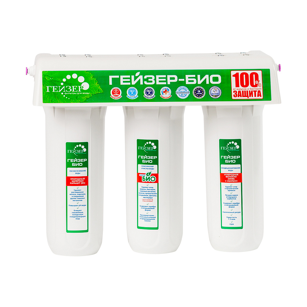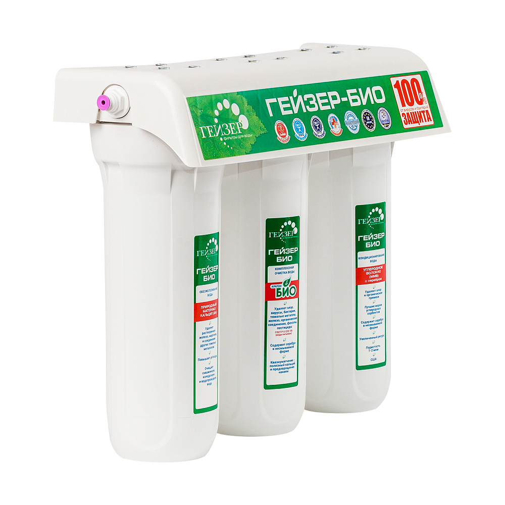 Трехступенчатый высокоэффективный бытовой фильтр для очистки воды Гейзер БИО 341 – лучший выбор для районов с железистой водой, в том числе и в Московском регионе. Эта модель класса «Элит» укомплектована тремя фильтрующими картриджами специального назначения: БА, Арагон Ж БИО и ММВ.