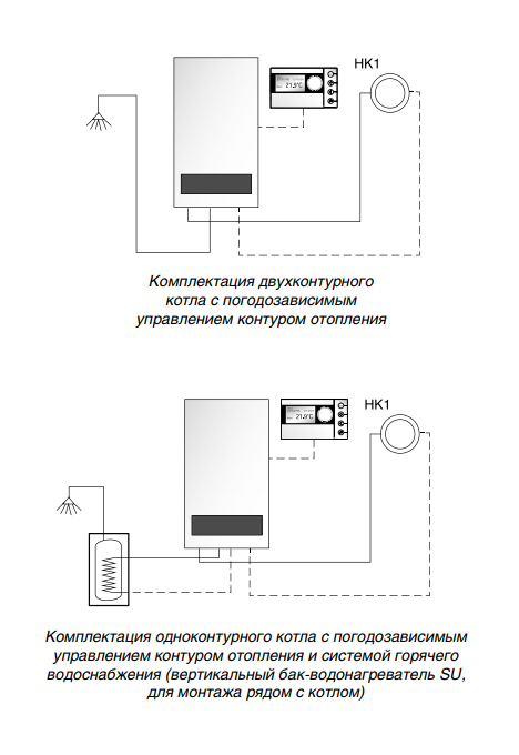 - • Возможна эксплуатация в погодозависимом режиме, регулирование модулированной горелки по наружной или комнатной температуре.