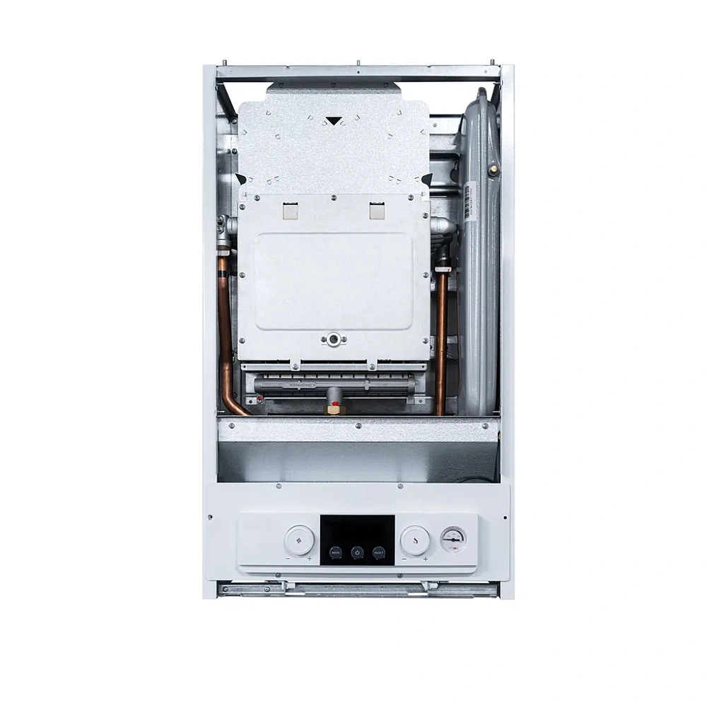 Котел работает по конвекционному принципу, оснащен раздельными теплообменниками: первичный выполнен из меди, вторичный — из нержавеющей стали. Такая конструкция повышает надежность оборудования и упрощает обслуживание. КПД котла составляет 87%, что обеспечивает стабильную и экономичную работу.