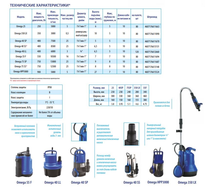 Задачи по откачке использованных, сточных или дренажных вод с легкостью решают при помощи компактных и простых в эксплуатации погружных насосов серии Omega.