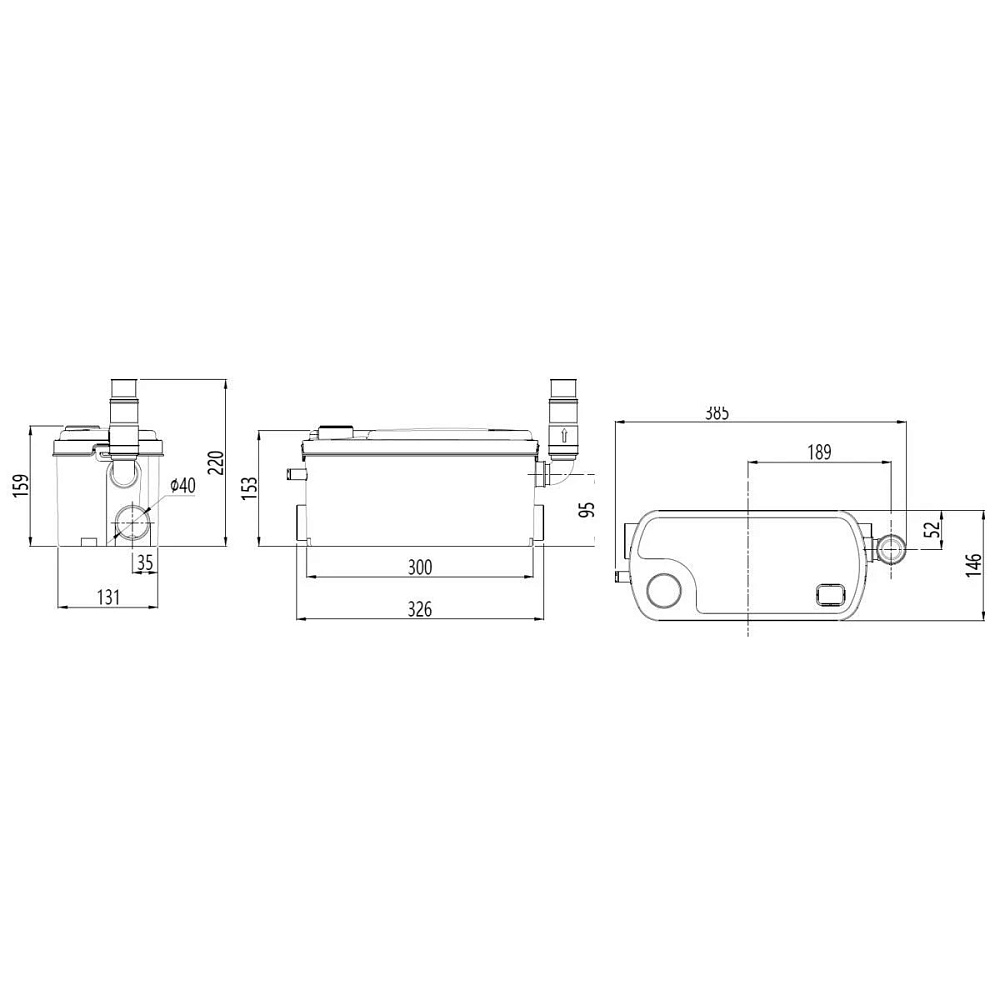 Бытовая канализационная насосная станция SANIVORT 255 M (напор 7 метров) — позволяет удалять сточные воды от раковин и душевых кабин, находящихся ниже уровня коллектора канализационной системы, а также в удаленных местах, где невозможно или нецелесообразно организовать канализацию самотеком. На верхней крышке станции имеется вентиляционное отверстие. Дополнительно канализационная насосная станция имеет отдельный вход с боку для приема конденсата от кондиционера. Также этот вход может использоваться для аварийного слива жидкости из канализационная насосная станция.