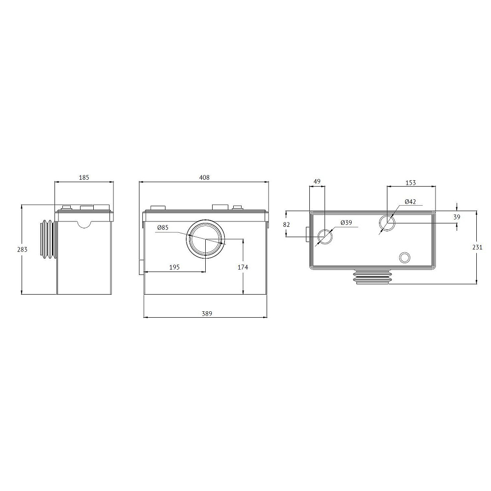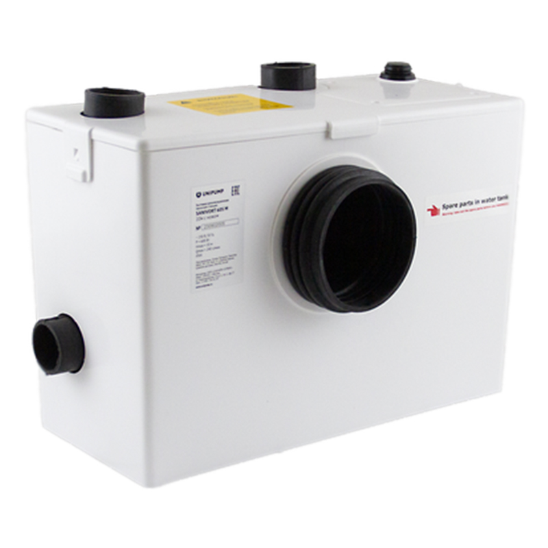 Вход от туалета (DN 100), 2 входа (DN 40) от раковин и т. д., напорный патрубок (DN 40)