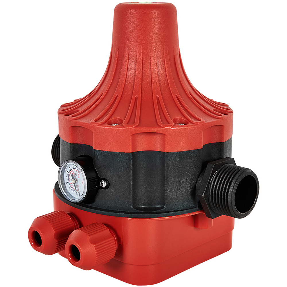 Блок автоматики представляет собой комбинацию реле давления и реле протока. В корпусе свободно перемещается в вертикальном направлении втулка расхода с магнитом. Когда водоразбора нет, то втулка под действием собственного веса опускается, размыкая контакты геркона. При наличии протока втулка поднимается, замыкая контакты геркона. Мембрана уравновешена давлением жидкости снизу и силой упругости пружины сверху. Мембрана посредством штока жестко связана с втулкой давления, в которую интегрирован постоянный магнит. Когда давление жидкости уменьшается, то втулка перемещается вниз, замыкая контакты геркона. Данные о состоянии герконов передаются в электронный блок. Настройка давления срабатывания производится с помощью настроечного винта. При водоразборе или падении давления ниже настроечного значения, блок включает насос, обеспечивая подачу воды потребителю. Величину давления включения пользователь может регулировать самостоятельно. При прекращении водоразбора, блок выключает насос с задержкой в 8 секунд, тем самым, предохраняя систему от гидравлического удара. При отсутствии воды во всасывающей линии блок отключает насос, предохраняя насос от работы в режиме «сухого хода». Встроенный в блок автоматики манометр позволяет визуально контролировать величину давления рабочей среды на выходе из блока.