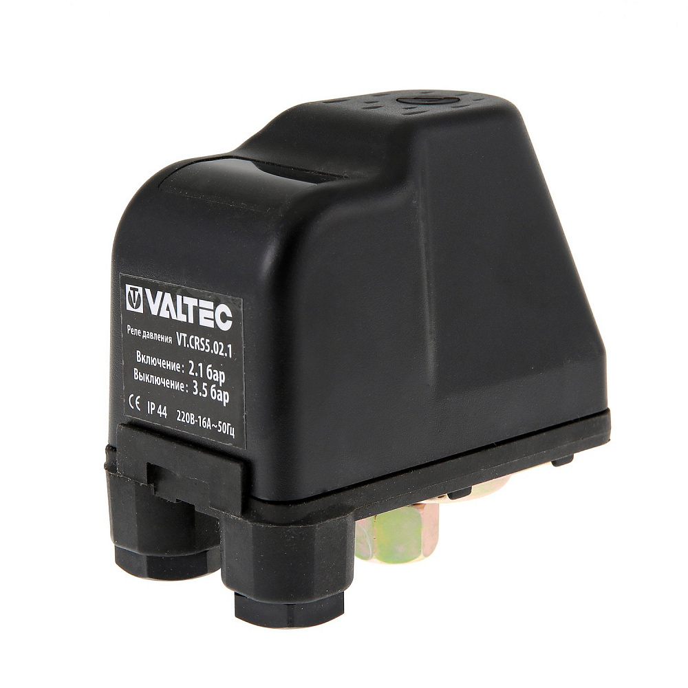 Реле давления VT.CRS5.02.1 – коммутационное устройство, предназначенное для автоматизации работы электронасосов водоснабжения. Реле включает и выключает насос при занижении и превышении заданных значений минимального и максимального давления. Заводская настройка – 2,1/3,5 бара. Пользователь может изменить ее по своему усмотрению в диапазоне 1,0–5,3 бара (минимальная разница значений – 1,0 бара).