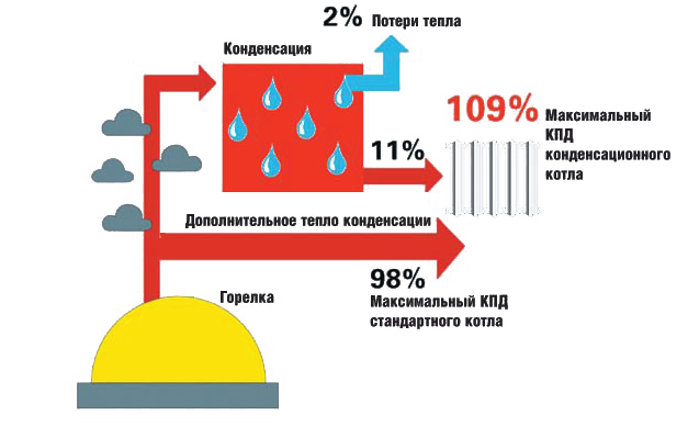 Традиционно для отопления используют тепло, которое получается в процессе горения топлива. При сгорании газа происходит химическая реакция, вследствие которой образуется водяной пар. В среднем температура уходящих из котла продуктов горения равна приблизительно 100—170 °C. При такой температуре пар, а вместе с ним и часть производимого тепла, удаляется из котла вместе с дымовыми газами.