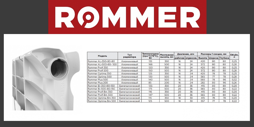 В биметаллических радиаторах Rommer внутренняя стальная оболочка представляет собой стальной коллектор из вертикальных и горизонтальных трубчатых элементов, соединенных между собой сваркой. Сварная конструкция под давлением заливается сплавом алюминия, соответствующего европейским нормам EN 46100, по этому, вода в радиаторах контактирует только со сталью, причем при производстве внутренней оболочки используется только коррозионностойкая сталь. Благодаря чему радиаторы выдерживают давление 20 атм.
