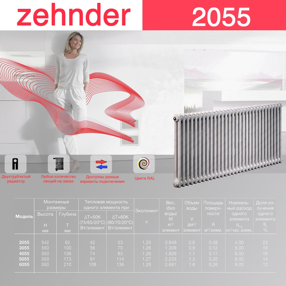 Zehnder Charleston 2055 - трубчатый стальной радиатор с 2 трубками в каждой секции.