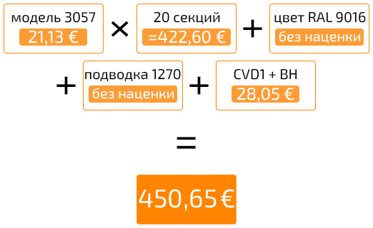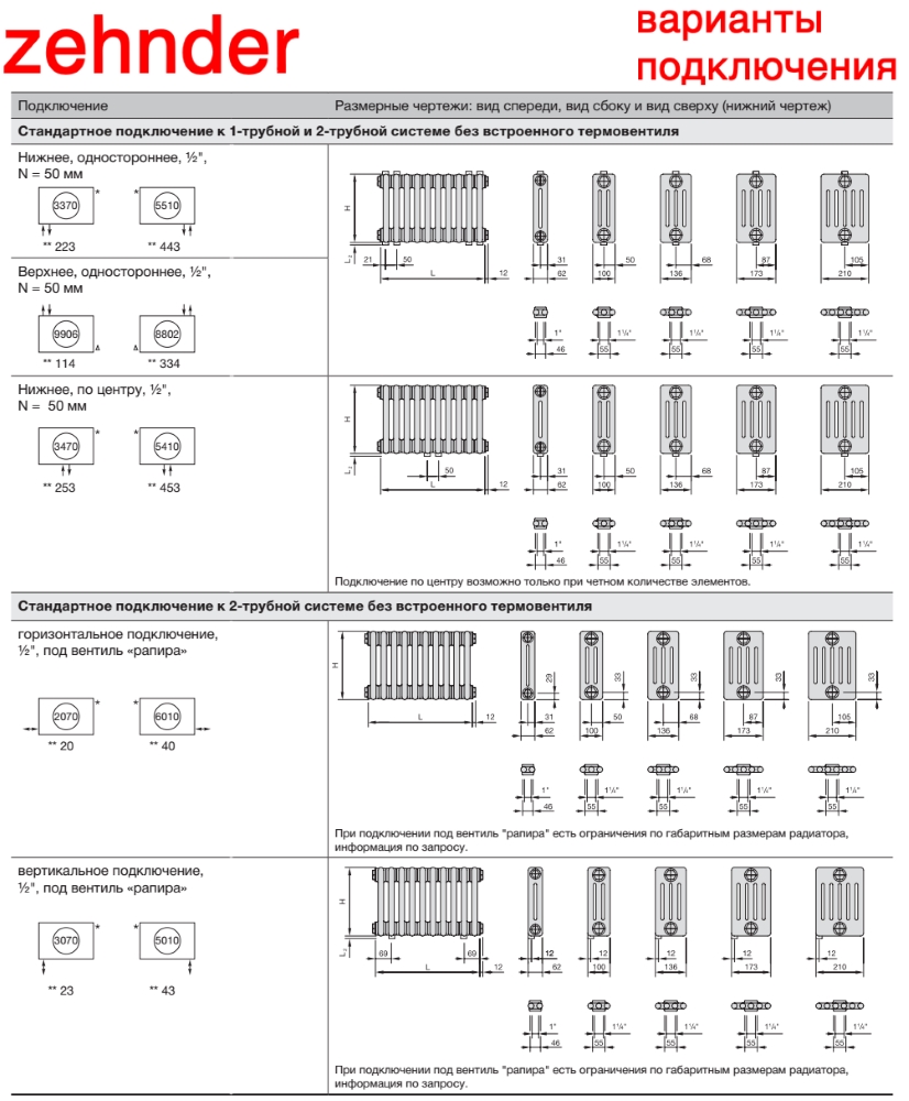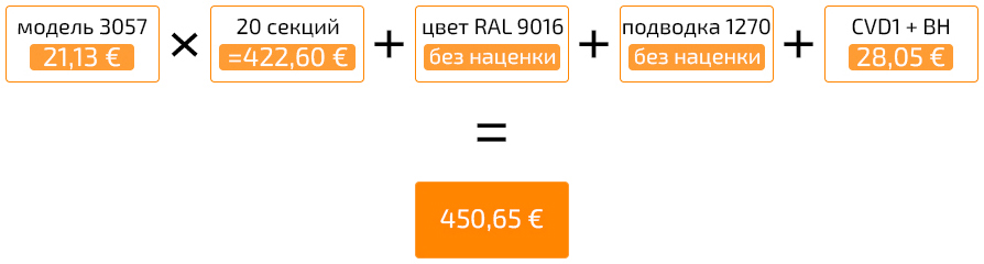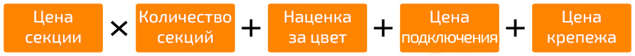 Радиатор производится по принципу "конструктора": для заказа необходимо выбрать количество секций, тип креплений, вариант подключения (нижнее, верхнее) и цвет. Подробная таблица расчёта находится ниже.