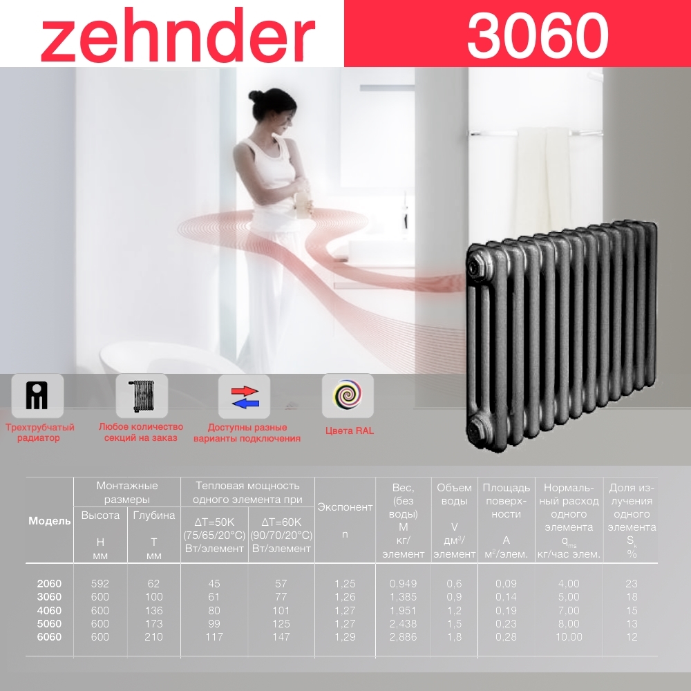 Zehnder Charleston 3060 - трубчатый стальной радиатор с 3 трубками в каждой секции.
