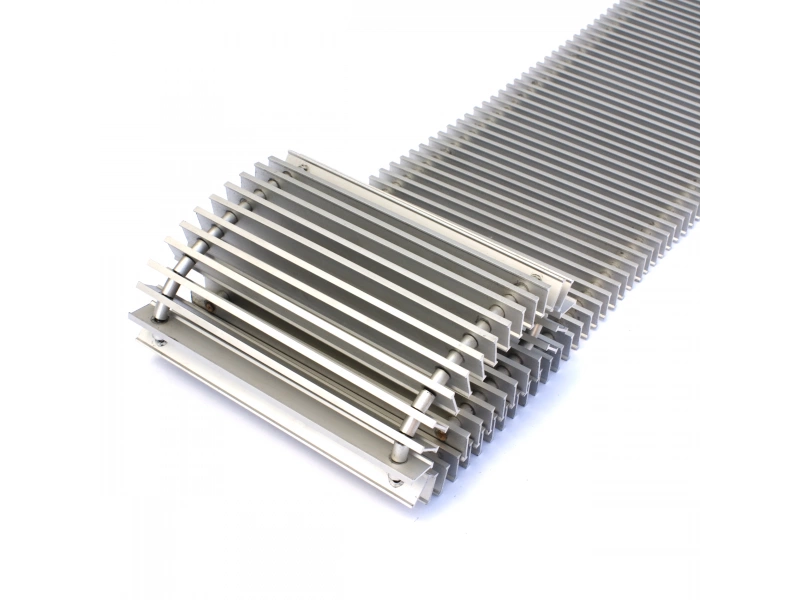 Декоративные решетки для конвекторов являются рулонными, гибкость ей придает стальная пружина внутри. Расстояние между пластинами 10 мм из-за чего обеспечивается высокая степень теплопередачи.Решетки изготавливаются из анодированного или крашенного алюминия разных цветов. Решетки РРА и РРД имеют ширину от 150 до 420 мм, длину от 600 по 4800 мм и могут использоваться не только в конвекторах Techno, но других производителей. Так же она выдерживает вес взрослого человека благодаря чему по ней можно спокойно ходить.