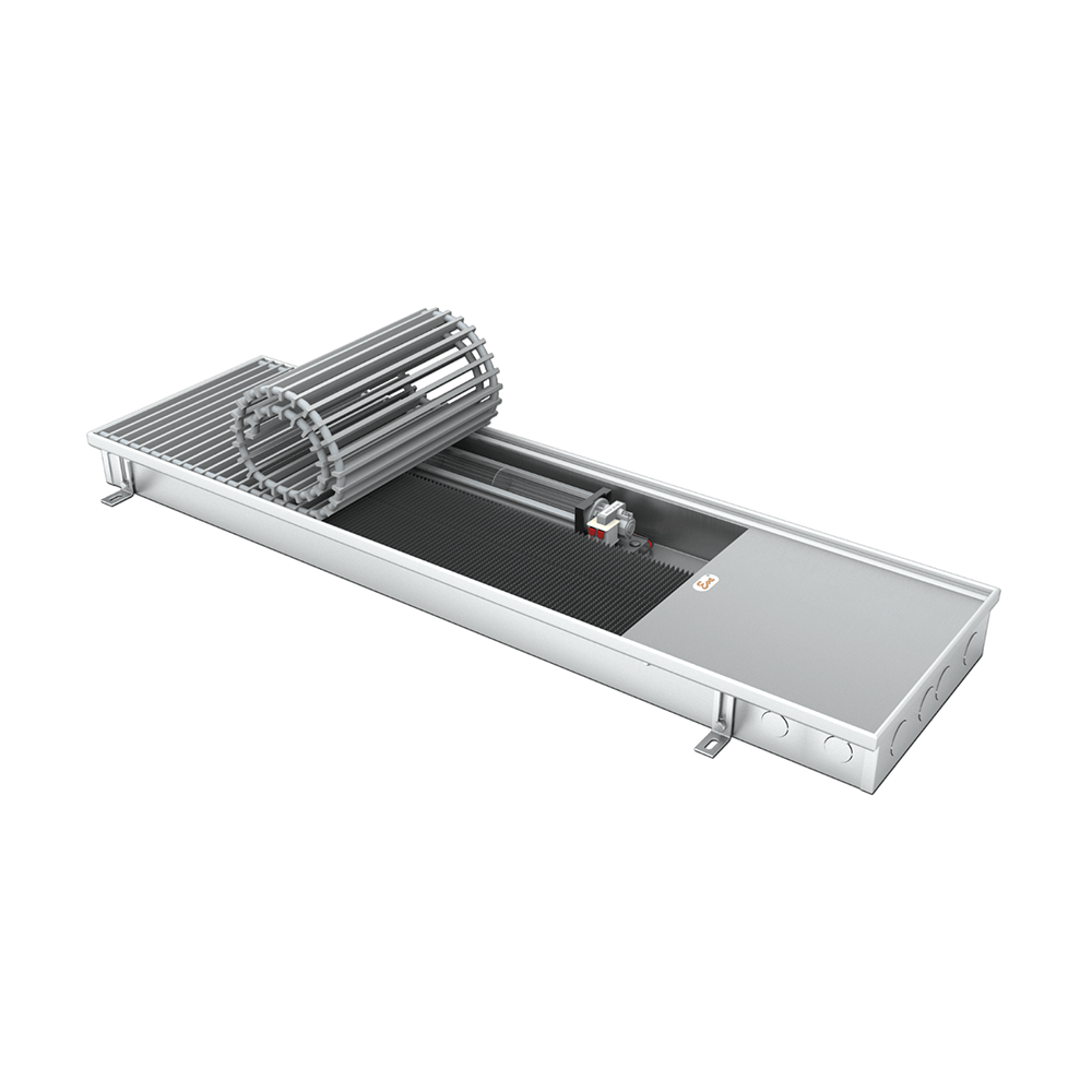 Встраиваемый в пол конвектор Eva KB с принудительной конвекцией - отопительный прибор, в котором установлен медно-алюминиевый теплообменник и тангенциальный вентилятор, тепло от которого передаётся в отапливаемое помещение путём естественной (при выключенном вентиляторе), и принудительной (при включённом вентиляторе) конвекции.