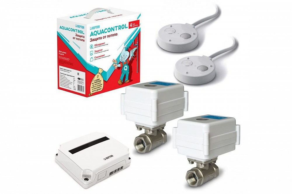 Комплект защиты от протечек воды Neptun Aquacontrol 1/2 предназначен для своевременного обнаружения и локализации протечек воды в системах водоснабжения и отопления. При аварии система перекрывает подачу воды и подаёт звуковое и световое оповещение.