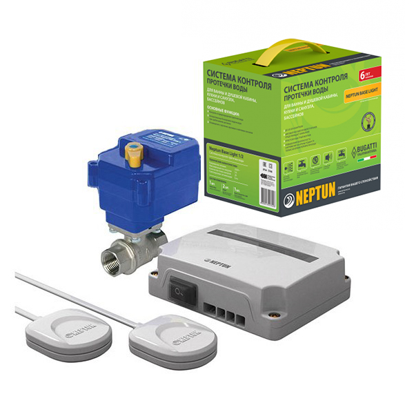 Проводная система защиты от протечки воды Neptun Base Light 1 относится к низкому ценовому сегменту за счёт использования одного крана. В комплект входят кран итальянской фирмы Bugatti и российские компоненты системы.