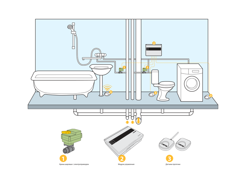 В комплект входят модуль управления Neptun Base, два датчика контроля протечки воды SW005 и один шаровой кран с электроприводом серии Neptun Bugatti Pro 220В.