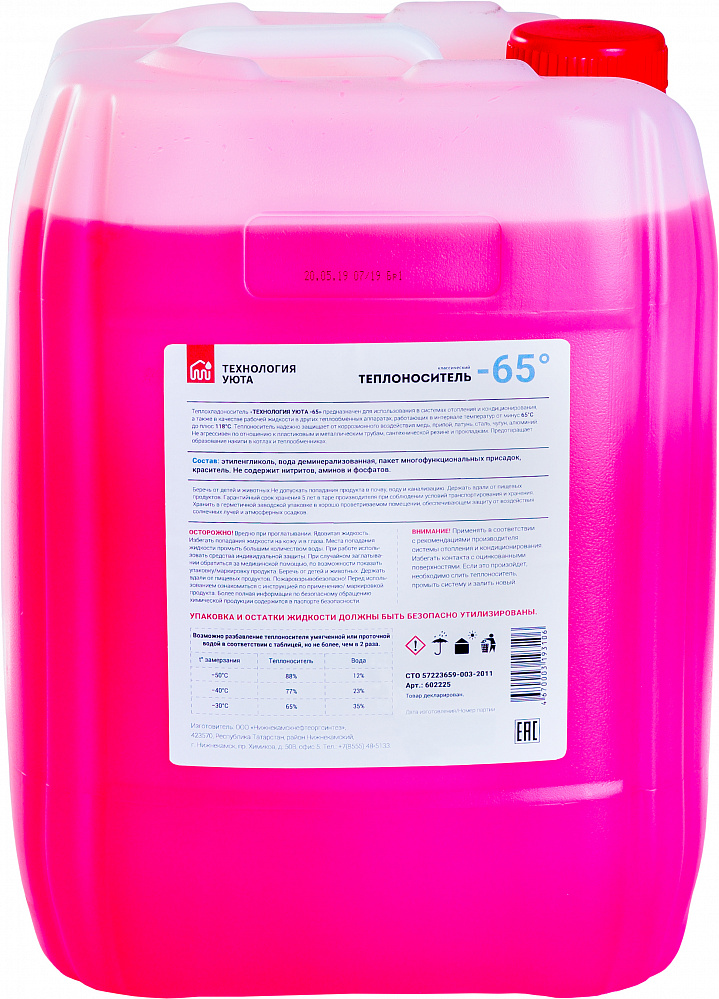 Теплохладоноситель "Технология Уюта-65" предназначен для использования в качестве низкозамерзающего теплохладоносителя в закрытых системах отопления, вентиляции и кондиционирования жилых и производственных зданий, для систем охлаждения производственного оборудования, чиллеров, холодильных агрегатов и т.д., работающих в тяжелых климатических условиях, где в качестве конструкционных материалов используются сталь, чугун, алюминиевые сплавы, медь и её сплавы.