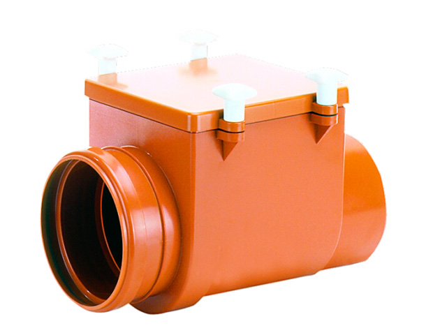 Механический канализационный затвор с запирающей заслонкой из профилированной нержавеющей стали с монтажным люком, раструбным входом и гладким выходом под трубы ПП, ПВХ.