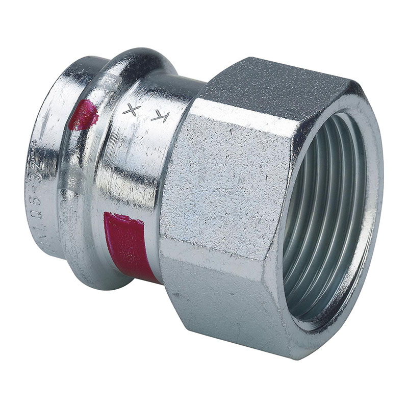 Соединительный элемент Prestabo с контуром безопасности SC?Contur из нелегированной стали с цинковым гальванизированным покрытием. Пресс-соединение, Rp-резьба. Комплектуется уплотнительным элементом из EPDM и внешним многогранником для гаечного ключа. Подходит для открытого и скрытого монтажа стояков и поэтажной разводки.