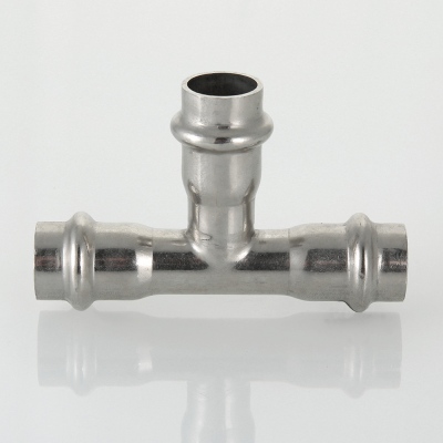 Трехраструбный пресс-тройник из нержавеющей стали обеспечивает соединение трех тонкостенных стальных труб систем водоснабжения, отопления, иных инженерных и технологических установок с рабочей температурой до 95 oС и давлением до 16 бар. Изделие изготовлено из стали AISI 304. Материал уплотнительных колец – эластомер EPDM Sh70. Благодаря бесштуцерной конструкции соединитель обладает малым коэффициентом местного сопротивления – сужение канала практически отсутствует. Фитинг рассчитан на обжатие с помощью пресс-инструмента V-профиля.