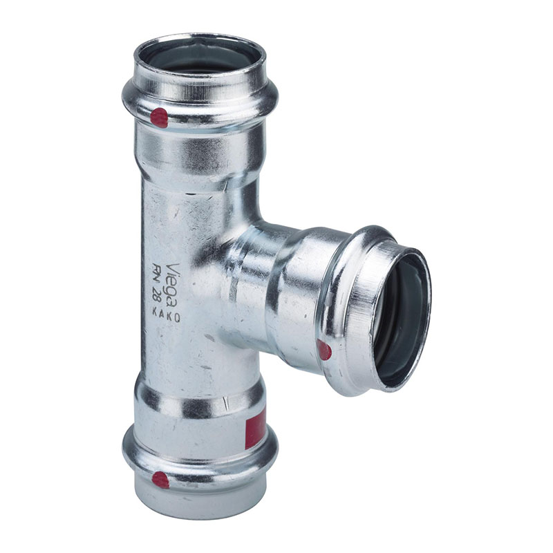 Тройник Prestabo с контуром безопасности SC?Contur из нелегированной стали с цинковым гальванизированным покрытием. Пресс-соединение. Комплектуется уплотнительным элементом из EPDM. Подходит для открытого и скрытого монтажа стояков и поэтажной разводки.