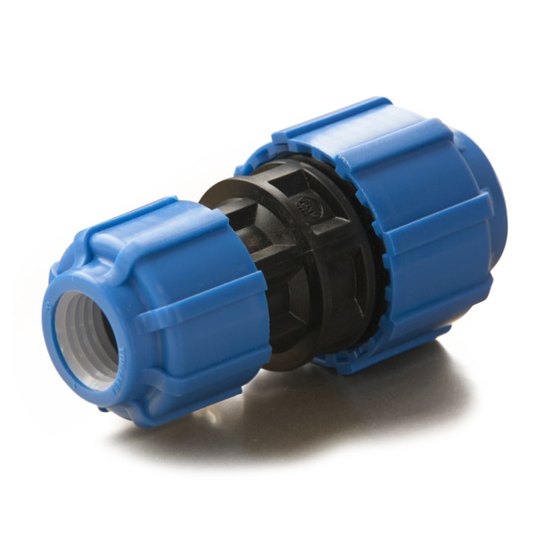 Муфта компрессионная соединительная переходная. Предназначена для перехода с трубы одного (большего) диаметра на трубу другого (меньшего) диаметра, в трубопроводных системах питьевого или технического водоснабжения с применением полиэтиленовых ПНД труб при строительстве систем полива на частных приусадебных хозяйствах, систем орошения городских газонов, или в сельском хозяйстве. При строительстве фонтанов, бассейнов, где нет необходимости использовать фитинги с повышенным запасом прочности, т.к. благодаря использованию облегченных материалов муфта компрессионная переходная имеет сниженную стоимость и может работать в трубопроводах с максимальным рабочим давлением до 16 атмосфер (PN16).