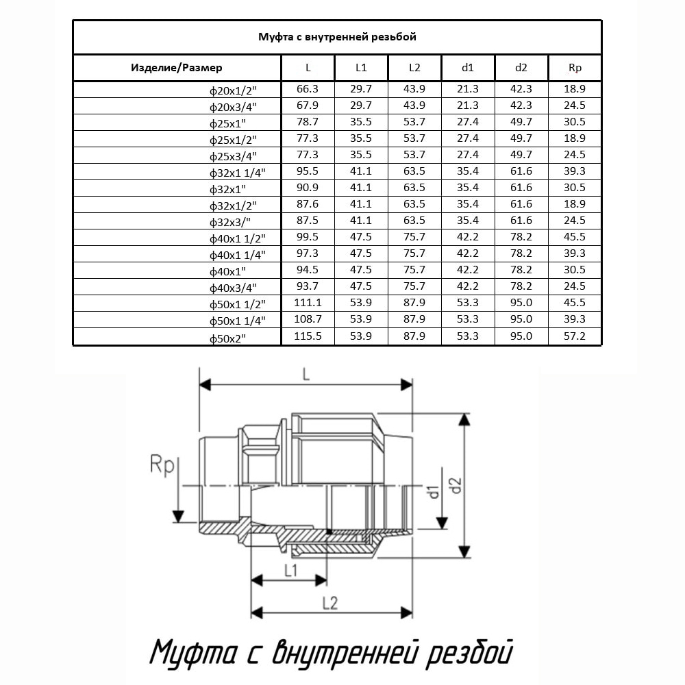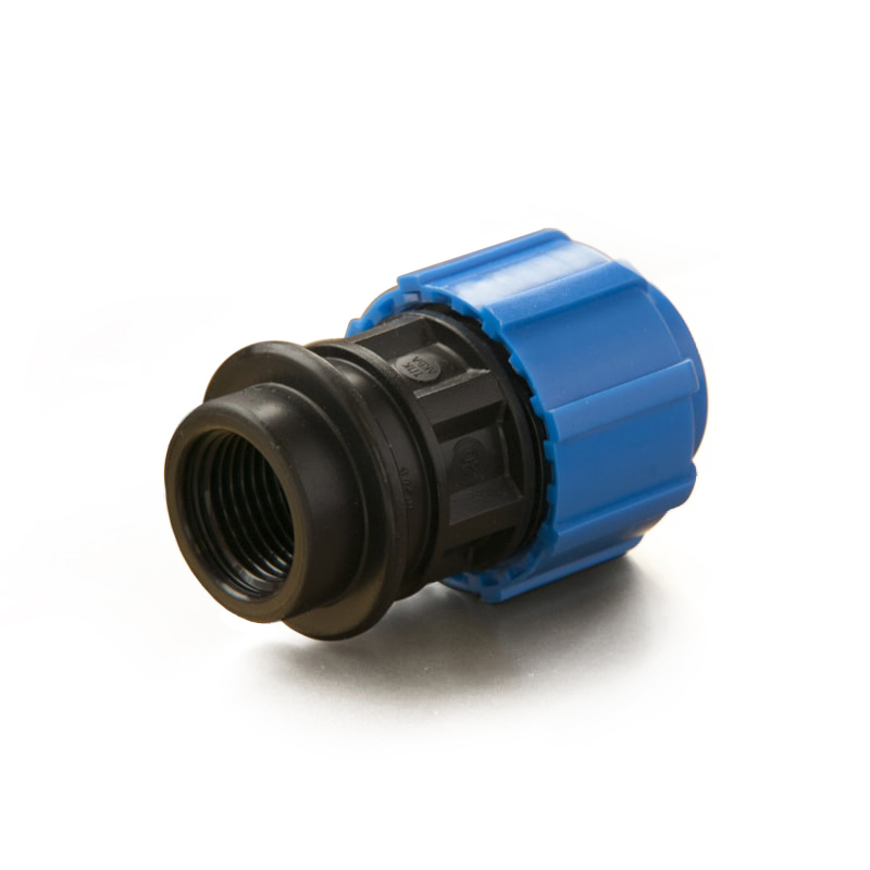 Муфта компрессионная с внутренней трубной резьбой. Предназначена, для возможности легкого перехода со стального трубопровода на трубопровод из ПНД труб, так как имеет резьбу соответствующую размерам и стандартам стальных трубных резьб. Кроме этого муфта компрессионная с внутренней резьбой может учувствовать в строительстве различных комбинаций отводов и разветвлений с применением других компрессионных ПНД фитингов.