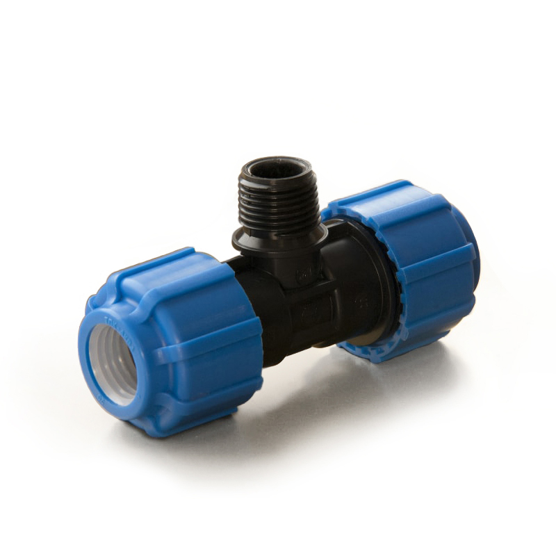 Тройник компрессионный с наружной трубной резьбой является универсальной деталью полиэтиленового трубопровода имеющий наружную резьбу с шагом, соответствующим стандартным размерам стальных труб, благодаря чему, этот тройник можно использовать для перехода с ПНД трубы на стальную и наоборот.