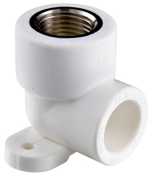 (VTp.754.0) Комбинированный угловой фитинг с креплением (полипропиленовая водорозетка), предназначенный для подсоединения к полипропиленовому трубопроводу сантехнического смесителя или другого компонента инженерной системы с резьбовым подключением. Резьба фитинга – внутренняя трубная по ГОСТу 6357.