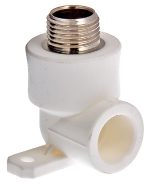 (VTp.755.0) Комбинированный угловой фитинг с креплением (полипропиленовая водорозетка), предназначенный для подсоединения к полипропиленовому трубопроводу сантехнического смесителя или другого компонента инженерной системы с резьбовым подключением. Резьба фитинга – наружная трубная по ГОСТу 6357, 1/2".