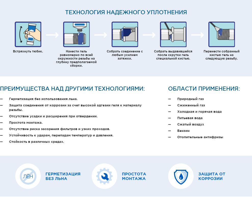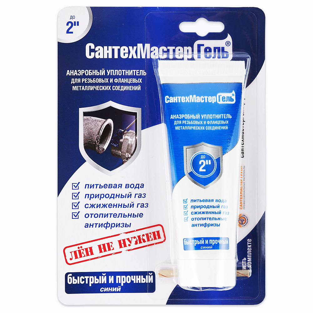 СантехМастер Гель Синий — это резьбовой герметик для сантехники со средней степенью фиксации соединения. Данный состав рекомендован к использованию для герметизации металлических резьб, фитингов и фланцев. Данный состав используется при герметизации резьбовых соединений труб диаметром до 2 дюймов. СантехМастерГель Синий рассчитан под демонтаж со средним усилием.
