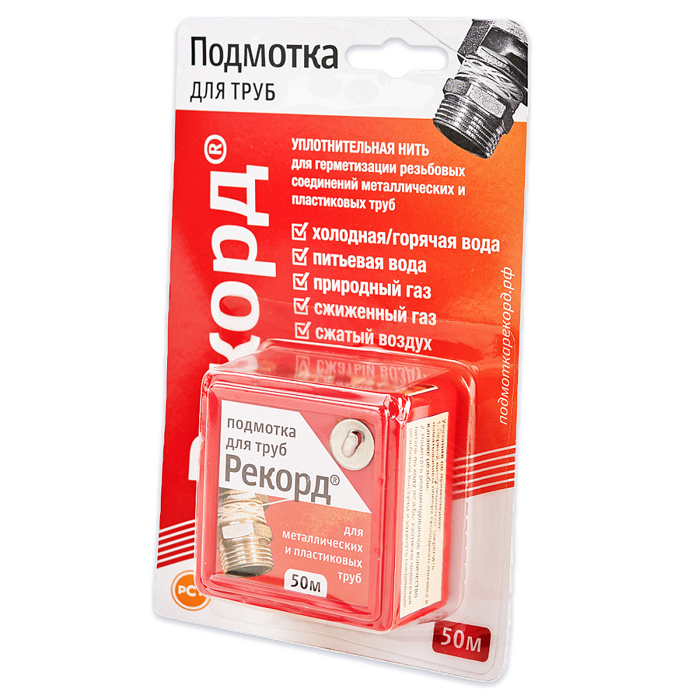 Подмотка Рекорд является универсальной нитью для герметизации резьбовых соединений и применяется в работе с природным и сжиженным газом, холодной и горячей водой, питьевой водой и со сжатым воздухом и защищает соединение от протечек на 20 лет. Она не разлагается, не разбухает и не засоряет трубопроводы и фильтра. Этот уплотнительный материал герметизирует резьбовые соединения мгновенно, выдерживает даже самые сильные вибрации и не разрушается при температурных перепадах от -60 ДО +150 °C.