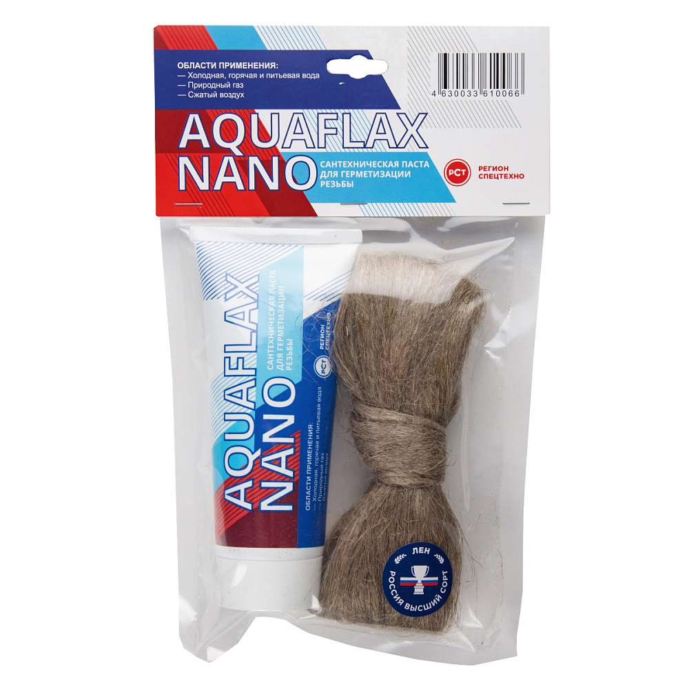 AQUAFLAX NANO - отечественная уплотнительная паста для льна, в состав которой входят наночастицы для усиленной пропитки волокон льняной подмотки для труб. За счет этого соединение становится герметичным и прочным на десятилетия.