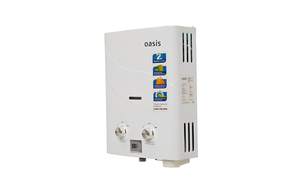 Газовый проточный водонагреватель «Oasis» B-12W служит для обеспечения горячего водоснабжения. От остальных водонагревателей «Oasis» этот прибор отличается отсутствием дымохода. Бездымоходные газовые проточные водонагреватели способны работать при низком давлении в системе водоснабжения. На лицевой панели газового проточного водонагревателя «Oasis» расположен ЖК дисплей, который обеспечивает удобную индикацию температуры горячей воды и контроль за работой прибора.
